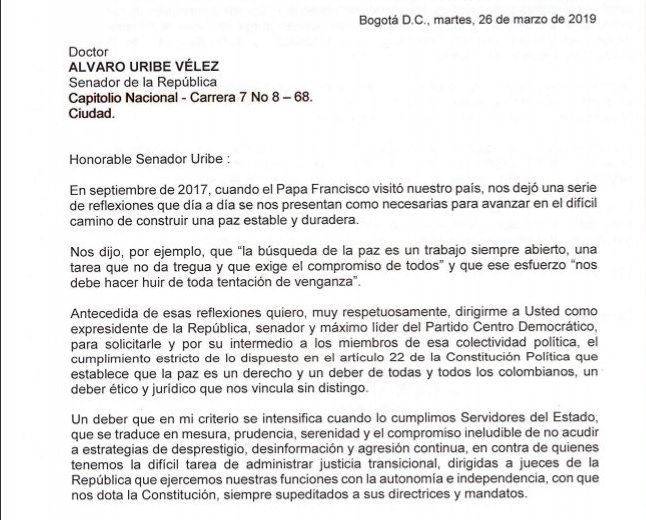 La presidenta de la Jurisdicción Especial para la Paz, JEP, Patricia Linares le escribió este martes una carta al expresidente y senador Alvaro Uribe Vélez en la cual le pide a él y a su partido Centro Democrático mesura, prudencia, serenidad y el compromiso de no acudir a estrategias de desprestigio, desinformación y agresión continua contra los integrantes del alto tribunal.