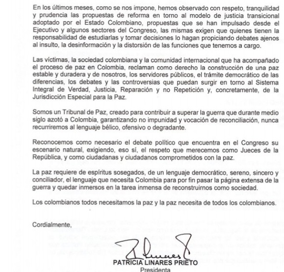 “Somos un Tribunal de Paz, creado para contribuir a superar la guerra que durante medio siglo azotó a Colombia, garantizando no impunidad y vocación de reconciliación, nunca recurriendo al lenguaje bélico, ofensivo o degradante”, precisa la presidenta de la JEP en su misiva al exmandatario.