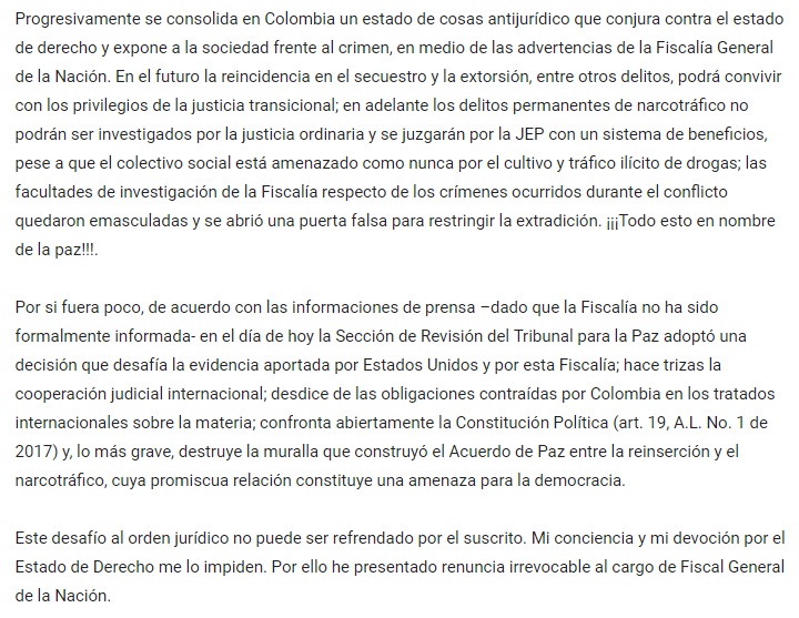 Según lo dicho por el Fiscal, su renuncia se debe a que La Jurisdicción Especial para la Paz, JEP, determinó este miércoles ordenar la libertad del excabecilla de las Farc alias Jesús Santrich, luego de establecer que aplica la garantía de no extradición porque las pruebas no permiten evaluar la conducta ni establecer la fecha precisa de realización del delito del narcotráfico del cual fue acusado.