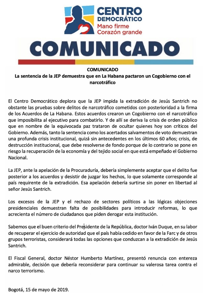 Las precisiones corresponden a un comunicado que a nombre de su partido Centro Democrático publicó el expresidente y senador Alvaro Urieb Vélez, en reacción a la decisión de la Jurisdicción Especial para la Paz, JEP, de no extraditar y ordenar la libertad del cabecilla de las exFarc alias Jesús Santrich.