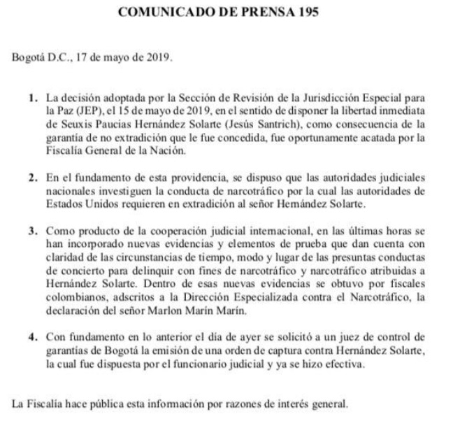 A través del siguiente comunicado, la Fiscalía General informó las razones de la recaptura de Santrich: