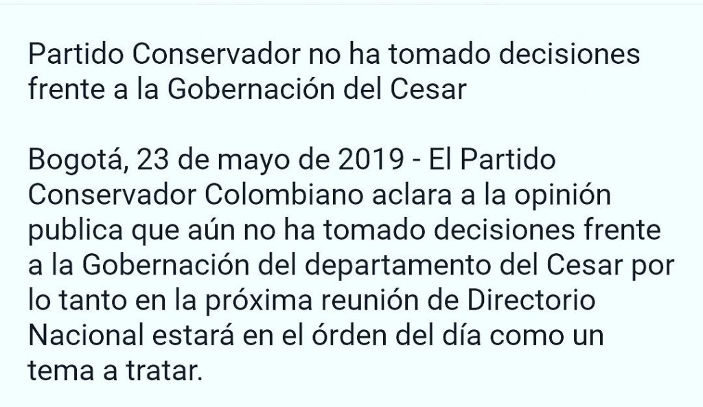 La semana pasada, Claudia Margarita Zuleta había recibido el coaval del Partido Conservador, pero en una jugada maestra de Cuelo Baute logró aplazar la entrega y buscar una reunión de las directivas conservadoras para el próximo jueves.