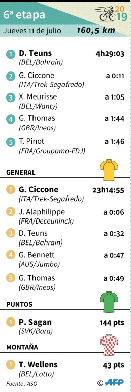 Al término de la primera llegada en alto de esta 106ª edición de la ‘Grande Boucle’, Teuns superó en la etapa a Ciccone, que llegó a 11 segundos, y al belga Xandro Meurisse, tercero a un minuto y cinco segundos.