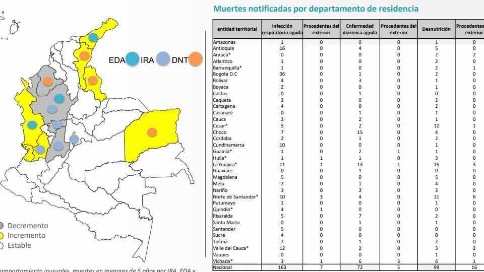 La Guajira sigue siendo el departamento del país con mayor número de casos de menores de cinco años muertos por desnutrición con 15, le siguen Cesar con 12 casos y Norte de Santander, con 11 niños muertos.