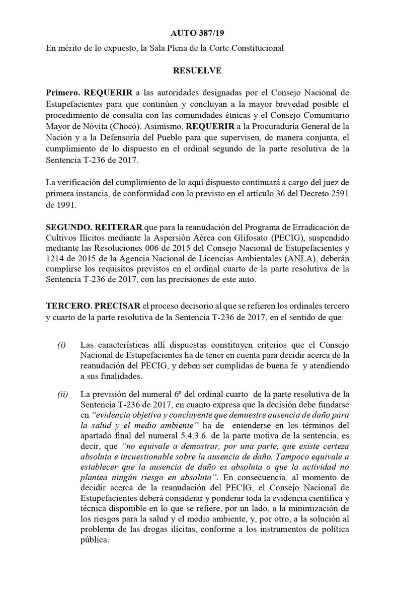 Empero, el alto tribunal establece que el Consejo Nacional de Estupefacientes debe tomar la decisión de reanudar la aspersión aérea con base en la sentencia T-236 de 2017, que no señala condiciones absolutas.