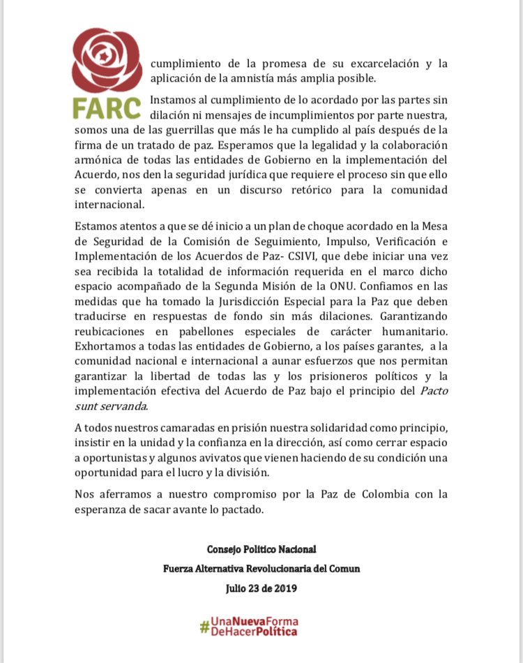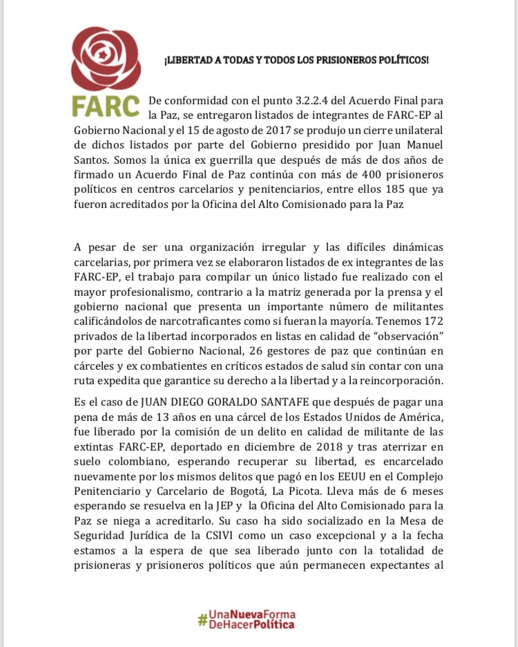 “Exhortamos a todas las entidades de Gobierno, a los países garantes, a la comunidad nacional e internacional a aunar esfuerzos que nos permitan garantizar la libertad de todas las y los prisioneros políticos y la implementación efectiva del Acuerdo de Paz”, precisa el escrito, cuyos términos son los siguientes: