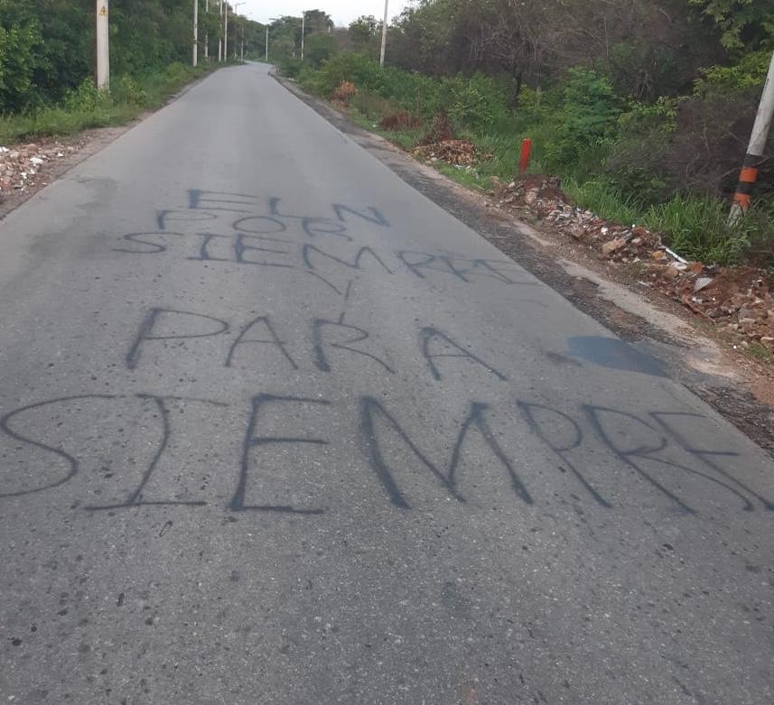 Aparece bandera y carretera pintada con menaje del ELN entre Valledupar – La Mesa