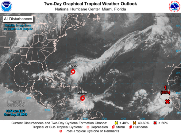 El Centro Nacional de Huracanes esta emitiendo advertencias sobre la Tormenta Tropical Jerry, localizada a varios cientos de millas al sur de Bermuda. El Centro Nacional de Huracanes esta también emitiendo advertencias sobre la recién formada Tormenta Tropical Karen localizada cerca de las Islas de Barlovento sur.