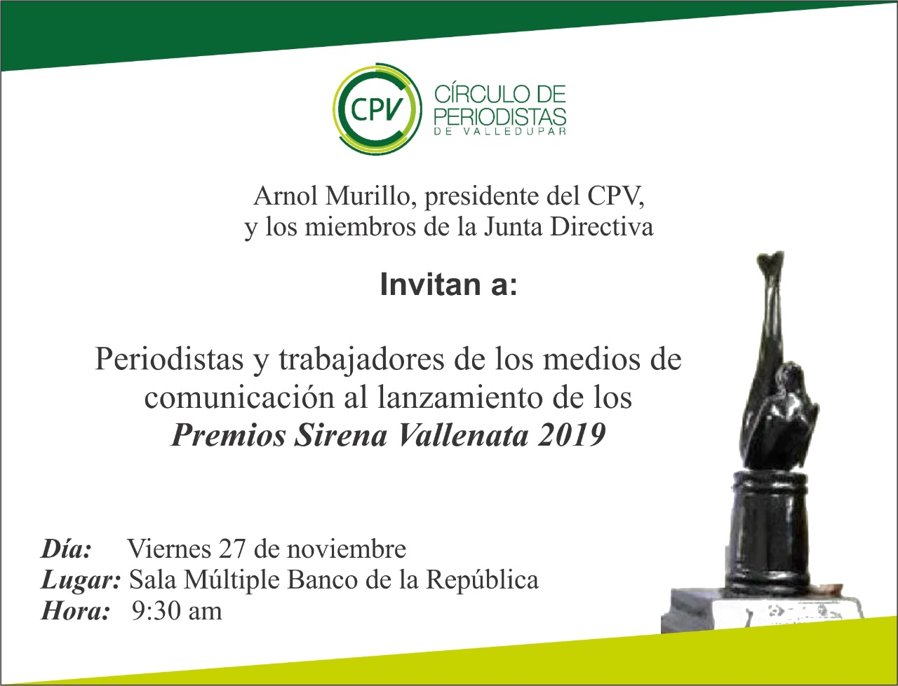 El Círculo de Periodistas de Valledupar realizará este viernes 27 de septiembre el lanzamiento oficial de los Premios Sirena Vallenata a partir de las 9 de la mañana, en la sala múltiple del Banco de la República.