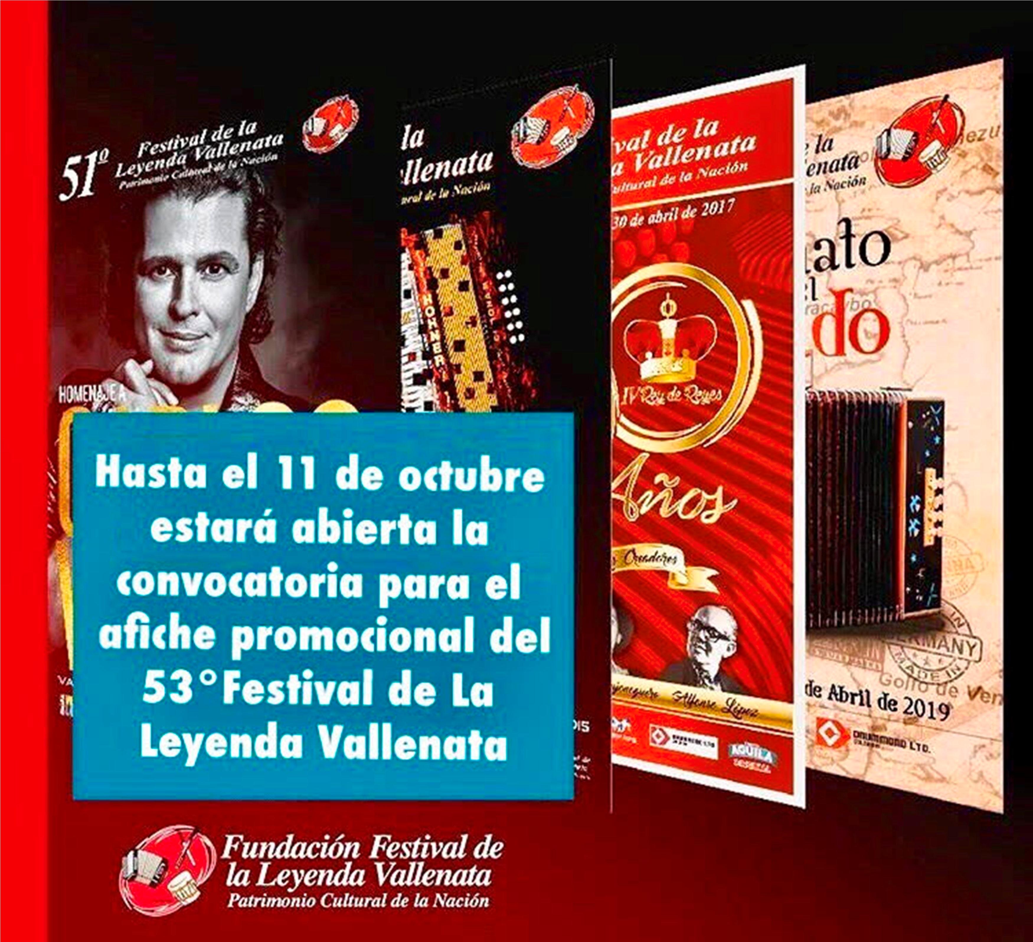 La Fundación Festival de la Leyenda Vallenata anuncia que hasta el 11 de octubre de 2019, estará abierta la convocatoria para la creación del afiche promocional del 53º del Festival de la Leyenda Vallenata, que se realizará del 29 de abril al 2 de mayo de 2020 y se le rendirá homenaje a Jorge Oñate, ‘La Leyenda’ y reconocimiento a Rosendo Romero, ‘El Poeta de Villanueva’.
