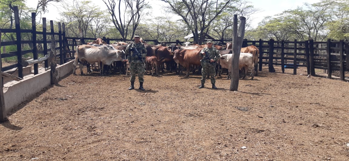 40 Cabezas de ganado que habían sido hurtadas en la finca ‘Rancho J y R’, fueron recuperadas por tropas de Batallón de Artillería N° 2 ‘La Popa’, que se encontraban realizando control militar de área, en el municipio de Bosconia, en el departamento del Cesar.