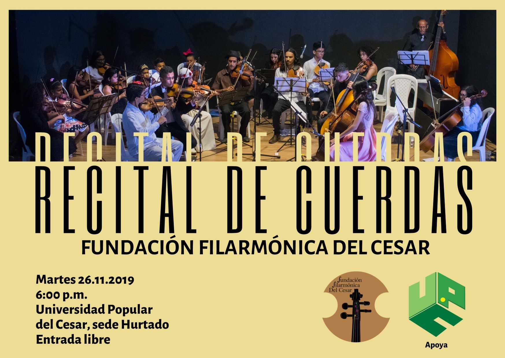 En su objetivo de acercar la música universal al público local, nuevamente la Fundación Filarmónica del Cesar convoca a la ciudadanía de Valledupar y poblaciones vecinas para que disfruten de las calidades musicales de sus estudiantes en un recital de cuerdas frotadas con el que clausura el año académico.