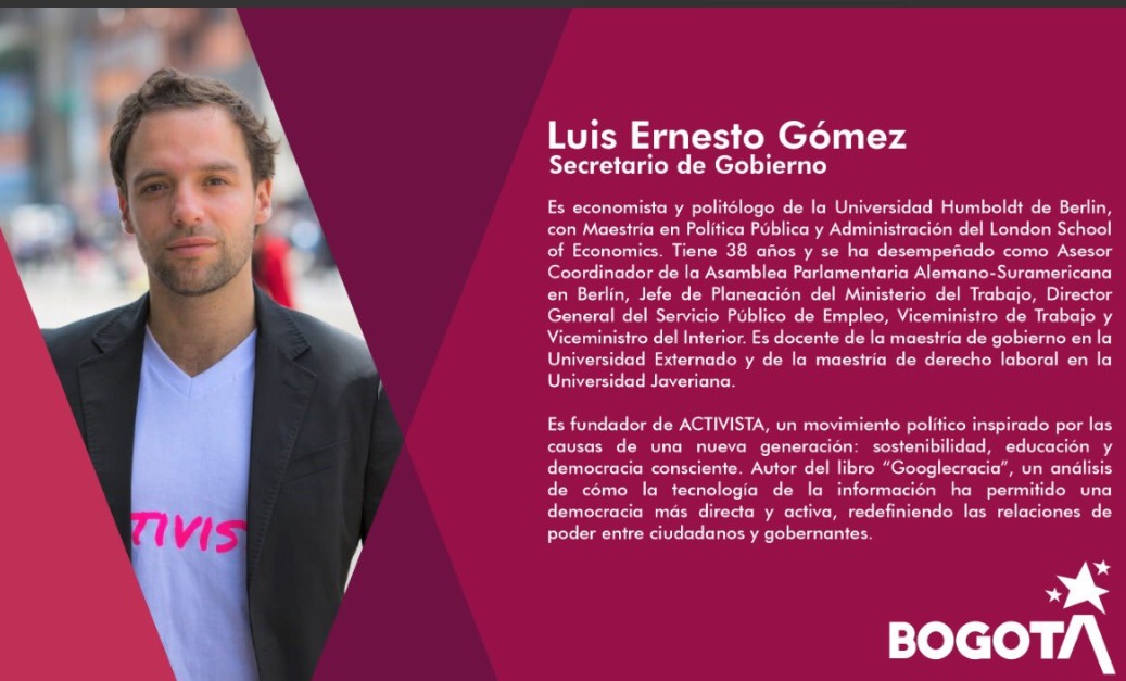 Claudia López, alcaldesa electa, comenzó a integrar el equipo de colaboradores que la acompañará a partir del primero de enero de 2020. El primer nombramiento corresponde al de Secretario de Gobierno Distrital, cargo que ocupará Luis Ernesto Gómez, economista y politólogo de 38 años, exviceministro de las carteras de Trabajo y del Interior.