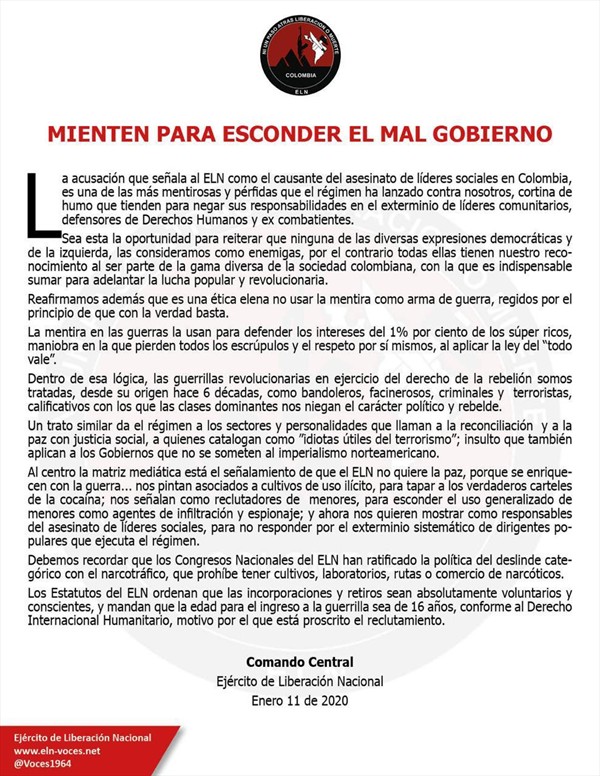 “La acusación que señala al ELN como el causante del asesinato de líderes sociales en Colombia, es una de las más mentirosas y pérfidas que el régimen ha lanzado contra nosotros, cortina de humo que tienden para negar sus responsabilidades en el exterminio de líderes comunitarios, defensores de Derechos Humanos y ex combatientes” afirma el comunicado.