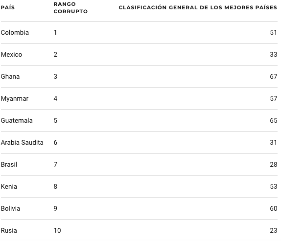 México quedó segundo en el deshonroso ránking de los países más corruptos, seguido por Ghana, Myanmar, Guatemala, Arabia Saudita, Brasil, Kenia, Bolivia y Rusia, salpicado por el escándalo del dopaje y la intromisión electoral, señala U.S. News.