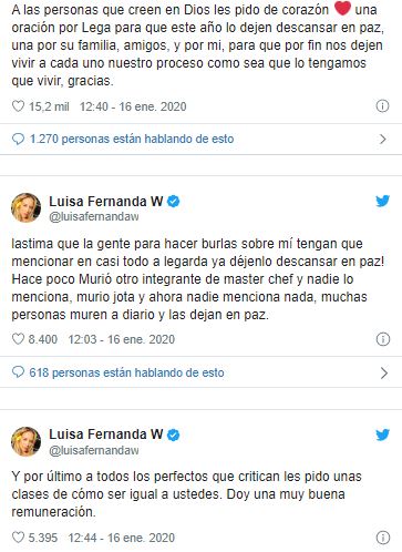 Cansada de los comentarios negativos, la youtuber acudió a su cuenta de Twitter a pedir que por favor dejaran descansar en paz y de una vez por todas a su fallecido novio. «A las personas que creen en Dios les pido de corazón una oración por Lega para que este año lo dejen descansar en paz, una por su familia, amigos, y por mí, para que por fin nos dejen vivir a cada uno nuestro proceso como sea que lo tengamos que vivir».