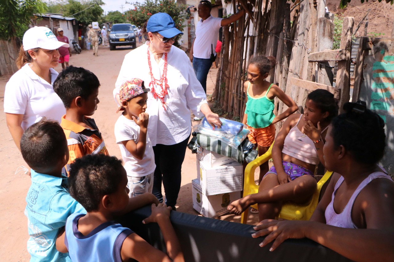 Las personas beneficiadas están asentadas en el barrio El Tiburón, a donde llegó la Primera Dama del departamento, Cielo Gnecco de Monsalvo, quien fue la encargada de entregar uno a uno, los paquetes de ayudas que contenían kits alimentarios, de aseo y cocina, colchoneta, hamaca y frazadas para cada familia afectada.