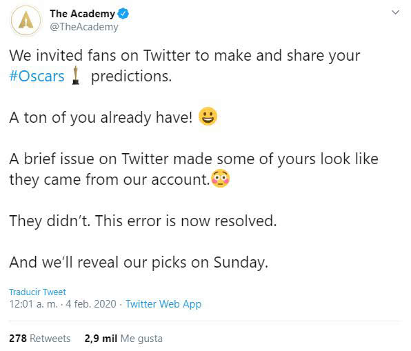 Fue tanta la polémica que se generó que a las pocas horas se eliminó la publicación en la cuenta de Twitter y la misma organización debió salir a dar explicaciones. La Academia aclaró que todo se trató de un juego llamado Oscars Prediction Experiencie, que consistía en habilitar una papeleta de votación, donde las personas escribían quien creía que iba a ganar.