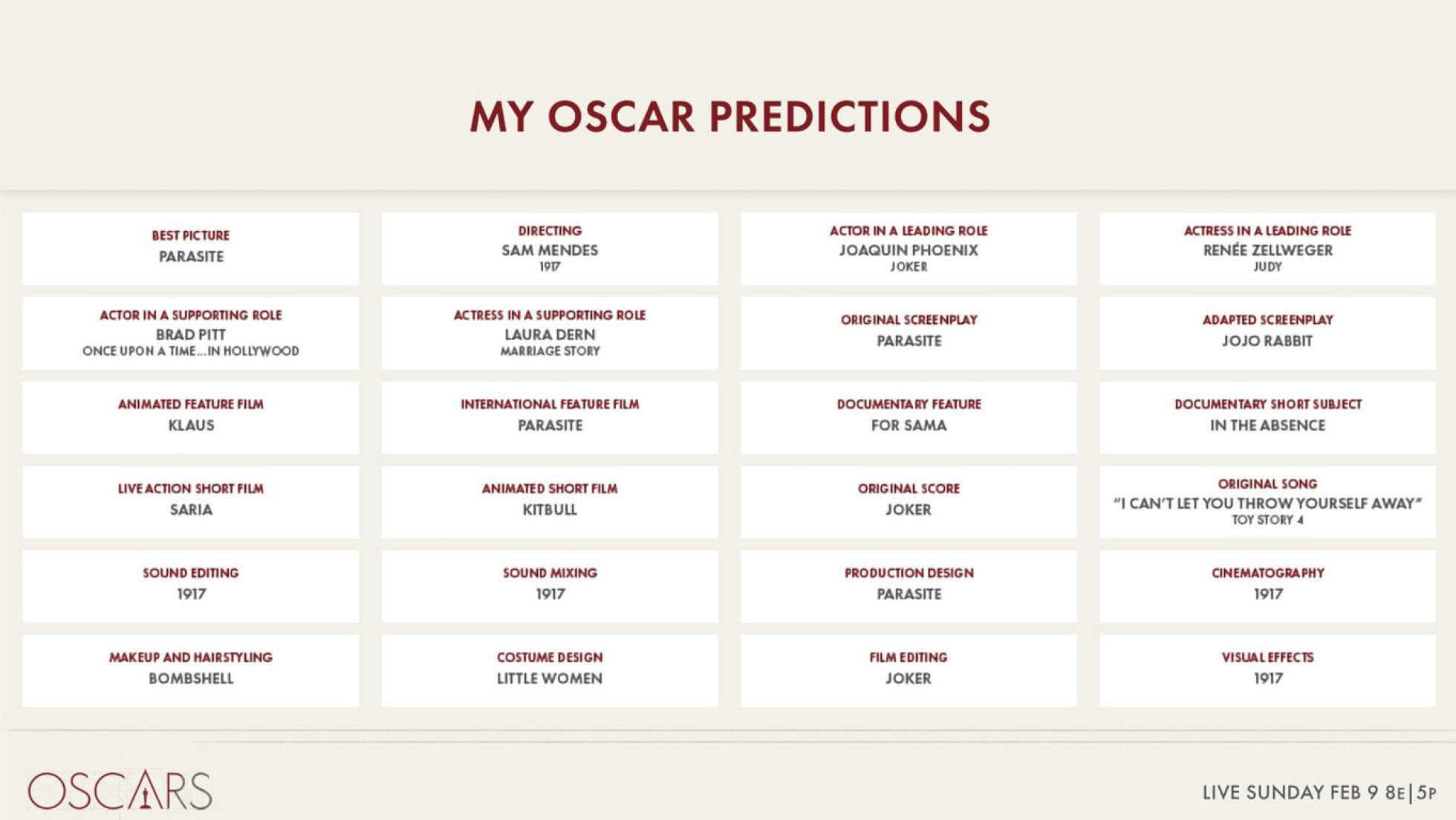 En la llamativa lista de posibles ganadores, el galardón a Mejor Película se lo llevaba ‘Parásitos’, de Bong Joon-ho; el Mejor Director era para Sam Mendes por 1917; Mejor Actor, Joaquin Phoenix por ‘Joker’ y Mejor Actriz, Renée Zellweger por ‘Judy’.