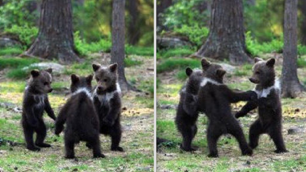 ¿Cuál sería tu reacción si vas caminando solo por el bosque y de repente te topas con tres crías de oso bailando entre ellos?