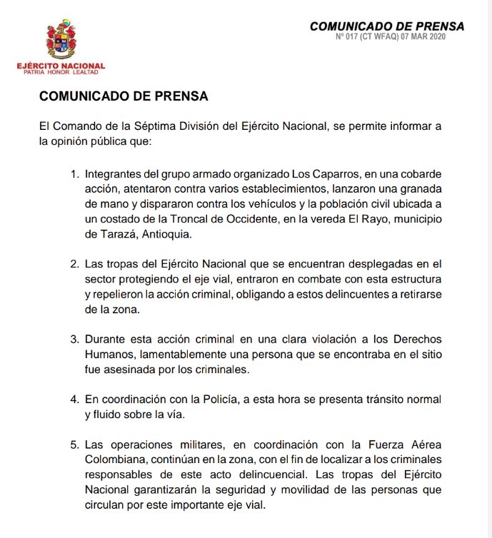 El Comando de la Séptima División del Ejército se pronunció mediante un comunicado sobre estos hechos ocurridos en el Bajo Cauca antioqueño e informa a la opinión pública que: