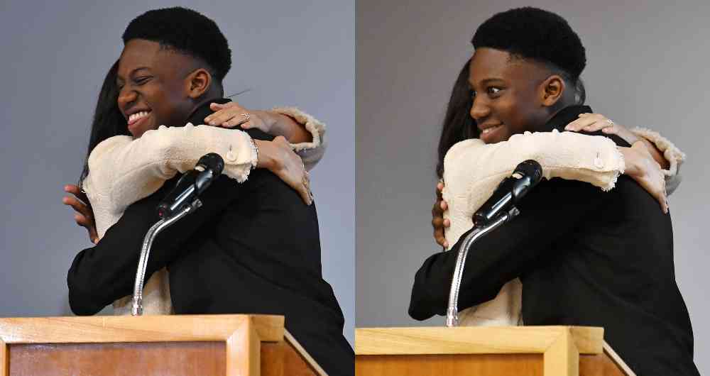 Tras unas palabras en honor a las mujeres, el joven estudiante terminó abrazando a Meghan Markle con una mirada al público que delataba toda su emoción. Un gesto que no estaba en el guion de ninguno de los presentes. Incluso la propia Meghan acabó reconociendo que le había sorprendido su confianza.