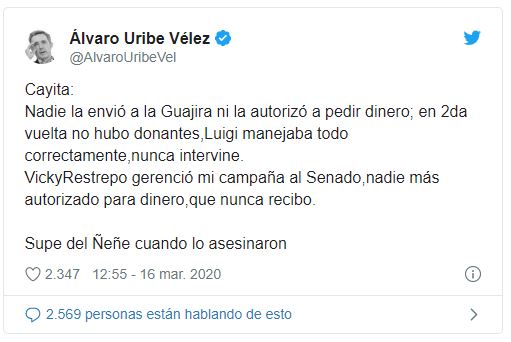 El expresidente Álvaro Uribe reaccionó luego de que Semana Noticias revelara que su exasesora María Claudia Daza sí habló con el ganadero asesinado Ñeñe Hernández. «Cayita: Nadie la envió a la Guajira ni la autorizó a pedir dinero; en 2da vuelta no hubo donantes, Luigi manejaba todo correctamente, nunca intervine. VickyRestrepo gerenció mi campaña al Senado,nadie más autorizado para dinero,que nunca recibo. Supe del Ñeñe cuando lo asesinaron», aseguró.