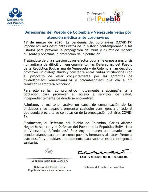 Finalmente, tanto el defensor del Pueblo colombiano, Carlos Negret y el defensor del Pueblo venezolano, Alfredo José Ruiz hicieron un llamado para «unirse como pueblos hermanos al hacer frente a este desafío y cuidarse mutuamente para superar esta contingencia».
