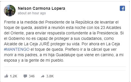 “Por ahora en La Ceja MANTENGO el toque de queda. Prefiero ir a la cárcel que ver morir a mis padres, a mi hija Guadalupe que viene en camino, a mi esposa y a la gente de mi pueblo”.