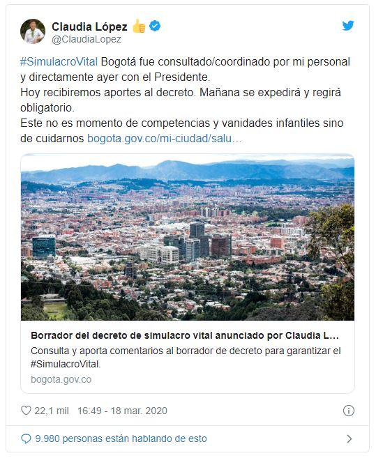 Otra medida que está en veremos por esta decisión del gobierno es el simulacro de aislamiento preventivo anunciado hace unas horas por la alcaldía mayor de Bogotá, y cuyo decreto que establecía la medida está a la espera de comentarios de la ciudadanía, y había sido socializado con el presidente, según el Distrito.