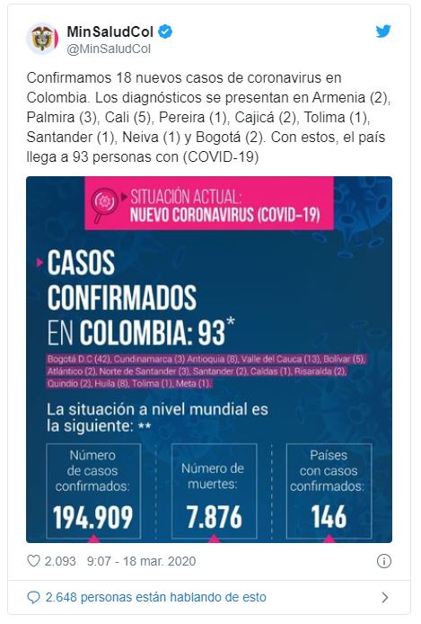 El coronavirus en Colombia aumenta día a día, minuto a minuto se presentan nuevos casos de sospechas en las principales ciudades. Sube a 93 los casos confirmados de coronavirus en Colombia.