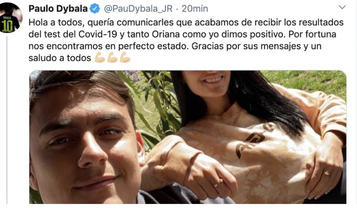 A través de sus redes sociales el jugador argentino, compañero de Juan Guillermo Cuadrado en Juventus, confirmó que dio positivo por coronavirus.