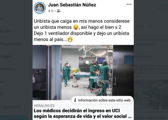 En la misma publicación donde difundía la triste información internacional, Núñez, escribió sin el mínimo estupor que si le llegaba un paciente uribista con coronavirus, él lo dejaba morir.
