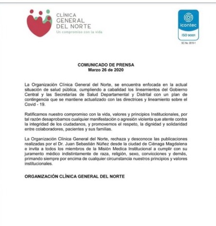 “La Clínica General del Norte rechaza y desconoce las publicaciones realizadas por el Dr. Juan Sebastián Núñez desde la ciudad de Ciénaga, Magdalena, e invita a todos los miembros de la Misión Médica Institucional a cumplir con su juramento médico indistintamente de raza, religión, sexo, convicciones y demás, primando siempre por encima de cualquier circunstancia nuestros principios y valores institucionales”, expresó el centro médico.