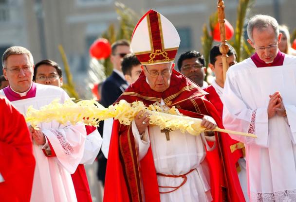Portando una túnica roja para simbolizar la sangre derramada por Jesús en las horas de su crucifixión, Francisco bendijo las palmas trenzadas.