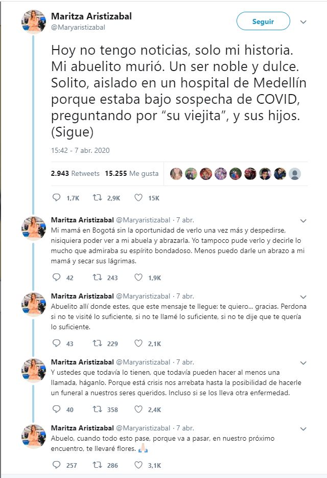 Aristizábal publicó en la red social: «Hoy no tengo noticias, solo mi historia. Mi abuelito murió. Un ser noble y dulce. Solito, aislado en un hospital de Medellín porque estaba bajo sospecha de covid-19, preguntando por “su viejita”, y sus hijos».
