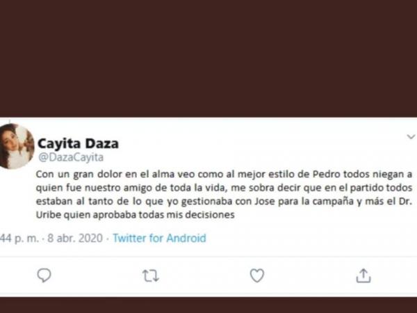 De acuerdo al trino, Cayita Daza se muestra muy dolida porque sus amigos del partido al que perteneció por mucho tiempo, ahora la ignoran y además al parecer al hablar de Pedro, se refiere a que nadie ahora conoce al amigo de todos, el Ñeñe Hernández .»Con un gran dolor en el alma veo cómo al mejor estilo de Pedro, todos niegan a quien fue su amigo del alma toda la vida. Me sobra decir que en el partido todos estaban al tanto de lo que yo gestionaba con Jose para la campaña y más el doctor Uribe, quien aprobaba todas mis decisiones«.