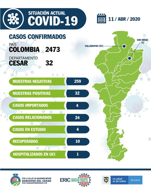 La Secretaría de Salud del Cesar reportó este sábado 11 de abril, Once (11) nuevos casos positivos de Covid-19 para un total de 32 casos positivos en el Departamento.