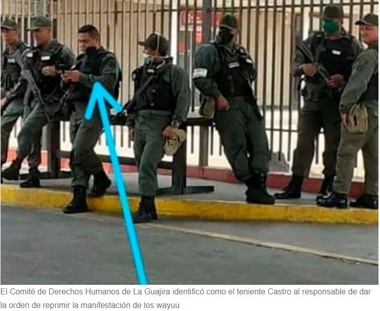 El teniente Castro es el presunto responsable de dar la orden de atacar a tiros a las personas que protestan exigiendo atención en Guarero”, denunció el Comité de Derechos Humanos de La Guajira en su cuenta de Instragram, donde incluyó una imagen en la que se puede observar a Castro junto a otros seis efectivos de la GNB.