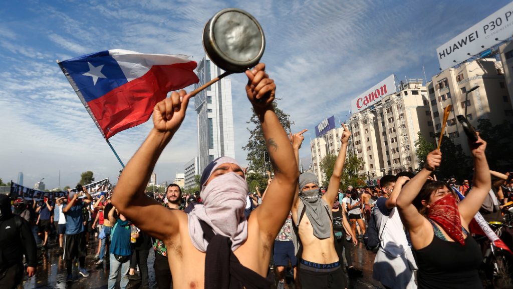 Unas 30 personas se manifestaban afuera de una estación del subterráneo, donde a menudo se registran protestas desde el estallido social y que prácticamente han desaparecido con la llegada de la pandemia del nuevo coronavirus.