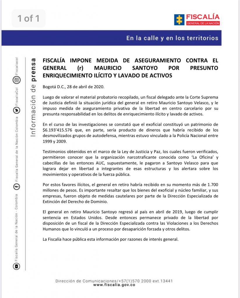 La Fiscalía impuso medida de aseguramiento privativa de la libertad en centro carcelario contra el general (r) Mauricio Santoyo Velasco por su presunta responsabilidad en los delitos de enriquecimiento ilícito y lavado de activos. Santoyo se desempeñó como exjefe de seguridad de la Presidencia durante la administración de Álvaro Uribe Vélez.