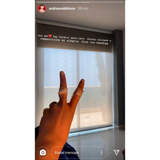 “Los amo. Hay Valdiri para rato. Pronto volveré a compartirles mi alegría. Dios los bendiga“, escribió la modelo, en una imagen donde se le ven curaciones en sus dedos mientras hizo el signo de la paz.