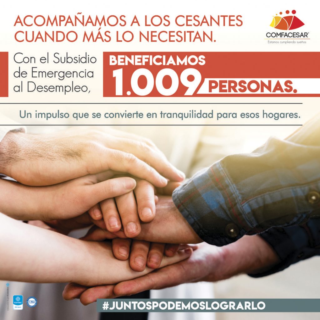 La Caja de Compensación Familiar del Cesar , COMFACESAR, comprometida en acompañar a los cesantes durante la crisis sanitaria que vive el país, brindó un apoyo económico de alrededor de $4.054.146.600 millones de pesos para beneficiar cerca de 1.009 personas que cumplieron con los requisitos dispuestos por el Gobierno Nacional, luego de postularse al Subsidio de Emergencia al Desempleo.