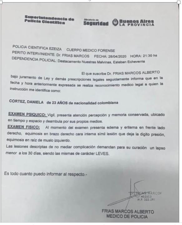 Antes de declarar, Cortés fue visitada por la mañana por profesionales de la psicología y a la hora de presentarse estaba más tranquila. En su testimonio, relató que fue agredida varias veces por Villa e incluso hasta dio el detalle de la última, según su narración agredida con una anillo de compromiso que le dejó marcas, verificadas por los peritos, que calificaron esta agresión como leve, como se ve en este documento. A las profesionales les había dicho, entr otras cosas, que «quiero lo que la ley requiera, estar en Colombia con mi Familia…no me interesa hacerle daño». Y la vez manifestó haber tenido conciencia que «un golpe mal dado acaba con tu vida». También contó que «cualquier discusión terminaba en golpes». Además, Cortés confesó que recibió golpes, patadas, puños, nunca necesité hospitalización», y que antes no solicitó asistencia para evitar que se hiciera público y no perjudicar la carrera de su pareja.