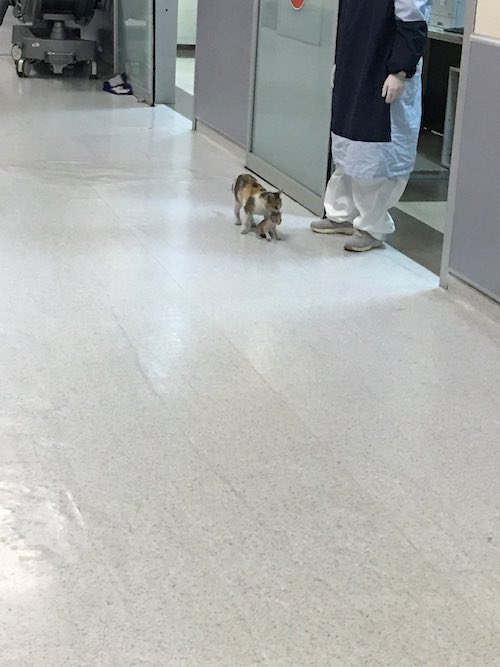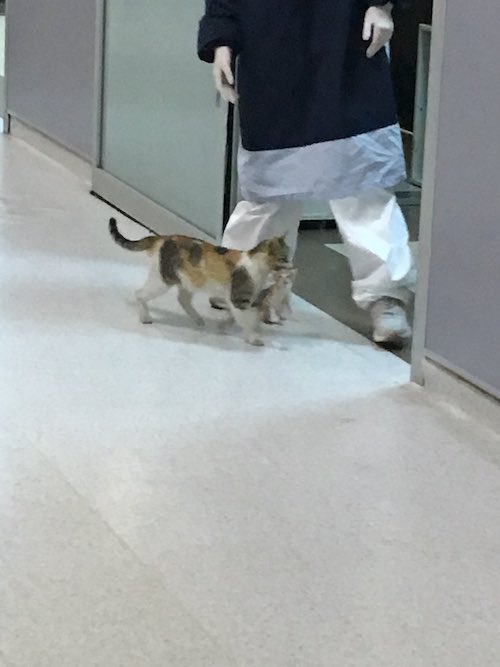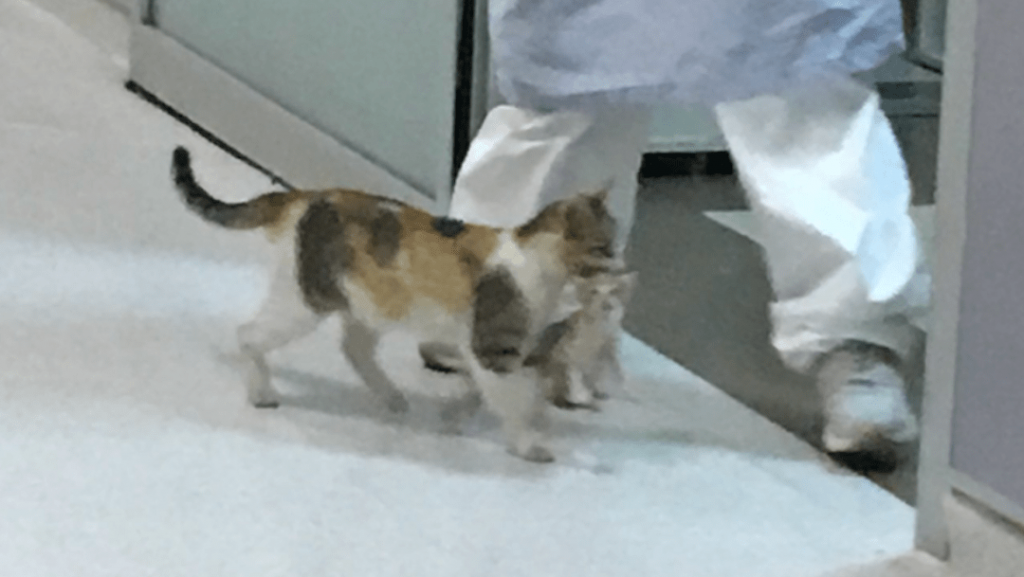 “La madre gata trajo a su minino a Urgencias del hospital y lo ayudamos. Había un veterinario. El minino está sano y salvo ahora”, se lee en el mensaje del internauta.