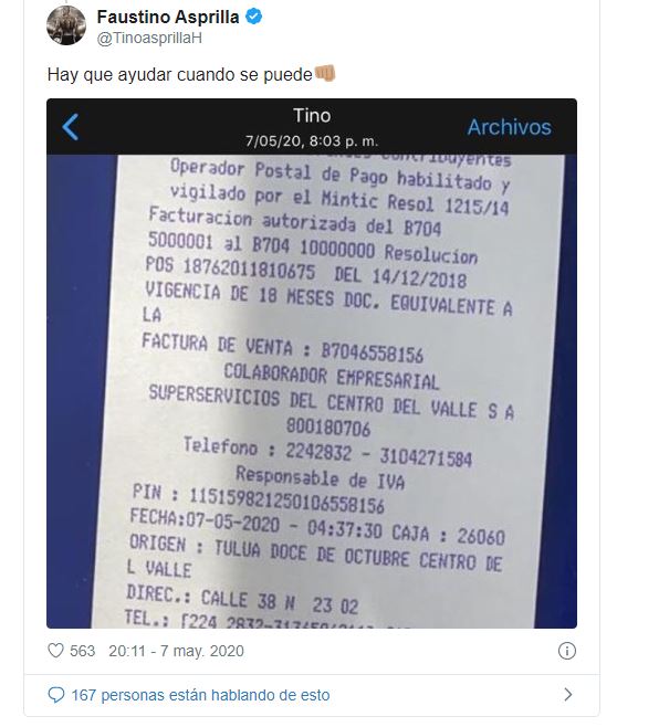 El exgoleador de la Selección Colombia Faustino Asprilla publicó en su cuenta de Twitter la transacción que le hizo a Indira Palomeque, vendedora de pescado en el Chocó y quien se hizo viral en las redes sociales por su video en donde muestra el desespero que vive por la crisis económica a causa de la cuarentena preventiva contra el coronavirus.