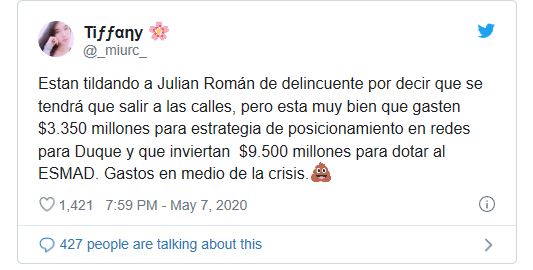 Resulta que el actor bogotano criticó el contrato para la nueva dotación del Escuadrón Móvil Antidisturbios (Esmad), el cual representó un costo de 9.515 millones de pesos para el Estado colombiano y aseguró que este se había hecho efectivo porque «Duque sabe lo que se viene después del confinamiento», advirtiendo así que nuevamente muchos ciudadanos saldrán a marchar al finalizar la emergencia.