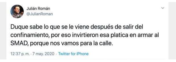 Sin embargo, el actor Julián Román volvió a hablar de las movilizaciones en su cuenta de Twitter, al criticar una vez más las decisiones del Gobierno Nacional, por lo que recibió varios insultos de los seguidores del presidente y su partido.