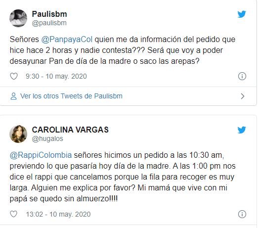 “Números sin respuesta, domicilios con retraso de 3 horas. Digan que no pueden cumplir y no le dañan a uno el desayuno del día de la madre”, exclamó una de las denunciantes en Twitter, identificada como Paula.