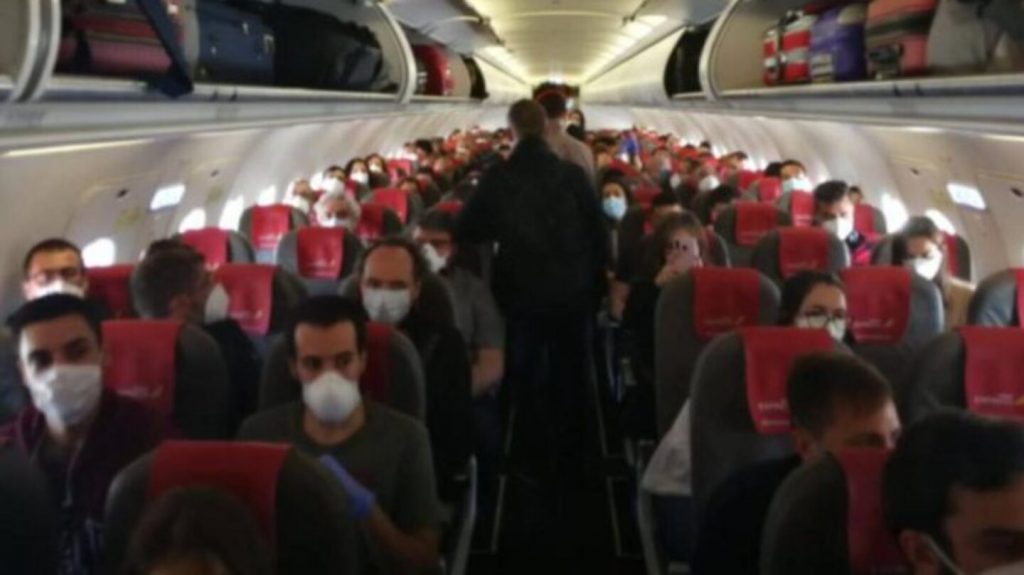 Dónde está la distancia de seguridad @Iberia? Va el avión casi completamente lleno y no hay ni siquiera un asiento de separación entre pasajeros. Esto es una VERGÜENZA. @el_pais @eldiarioes @elmundoes pic.twitter.com/HnOJDluCkh
